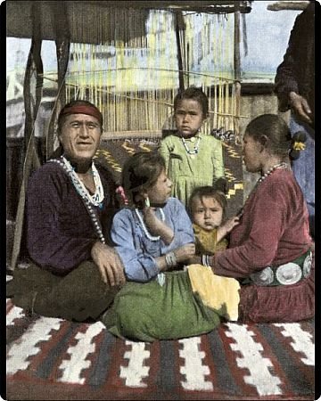 • Image Description: Navajo family seated in front of their blanket loom, about 1900. Hand-colored halftone reproduction of a photograph